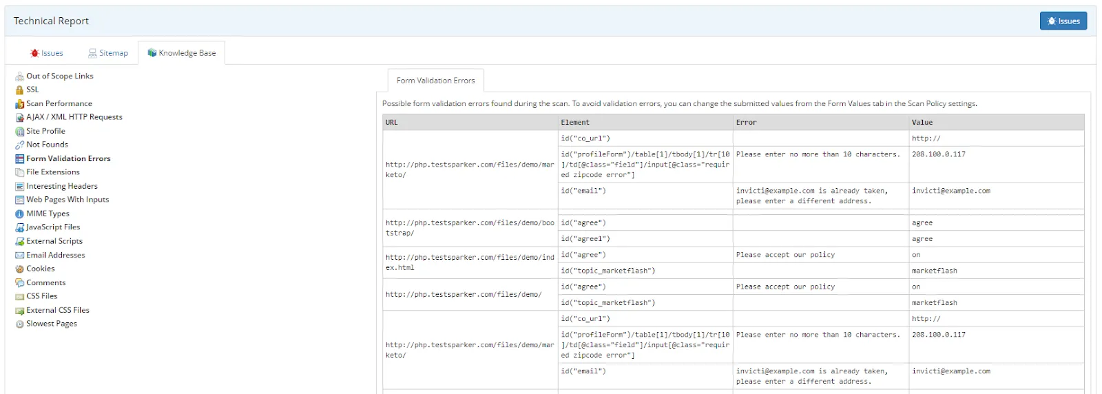 During the scanning process, Invicti Enterprise successfully validates web forms as part of the crawling stage. However, due to validation errors, some web forms could not be submitted, with the result that they were not displayed in scan reports. With this update, all validation errors that are encountered during the scan are now listed in a new Form Validation Errors node in the Knowledge Base tab of the Technical Report section of scan reports.