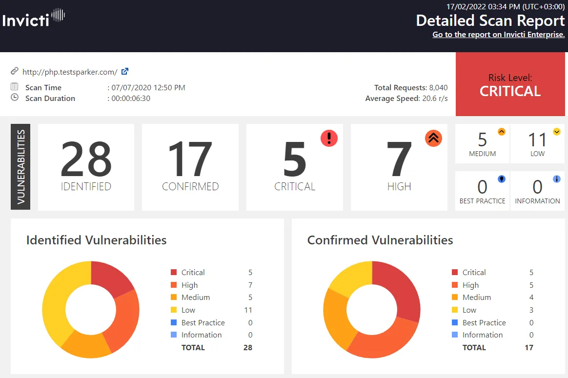 Invicti’s comprehensive technical reports are designed for those dealing with fixing vulnerabilities. Technical staff can employ them to easily grasp how Invicti has proved that the vulnerability can be exploited.To illustrate, technical reports such as the Detailed Scan Report provide a comprehensive security overview of the target web application. Written in a clear and accessible format, this report includes a summary that presents straightforward numerical and graphical information.