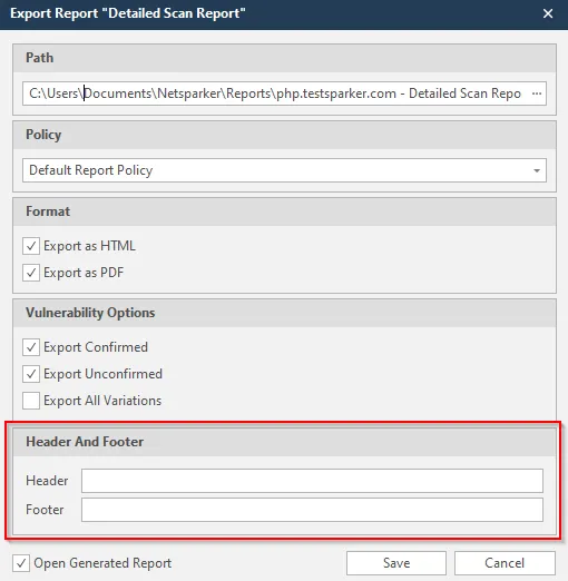 In addition to these new report templates, Netsparker now allows you to customize reports. You can add customized information that will appear in the header and footer section of the report.