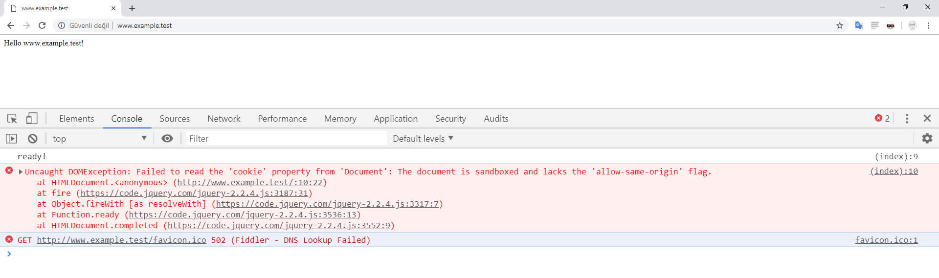 However we don’t want www.example.test to be able to read the cookies that are set for the other domains on *.example.test. If we return the CSP sandbox attribute in the response of www.example.test, we’ll prevent the www subdomain from reading the cookies set for other subdomains. Here’s a sample implementation of the sandbox attribute: