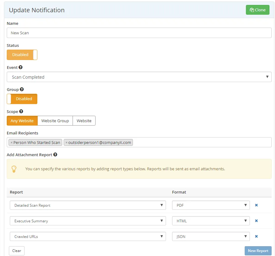 Netsparker enables you to send email and SMS notifications. With the April 2020 Update for Invicti Enterprise, we added the facility to configure notifications in the Update Notification window to email reports as attachments on the Scan Completed event, including to external recipients.