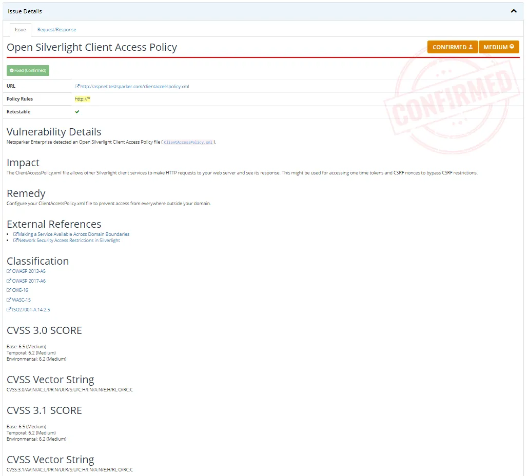 The Common Vulnerability Scoring System (CVSS) is a free and open industry standard for classifying the severity of computer system security vulnerabilities. CVSS assigns severity scores to vulnerabilities, allowing security staff managing detected issues to prioritize responses and resources according to the potential threat. We have added version 3.1 scores to vulnerabilities reported by Invicti Enterprise.