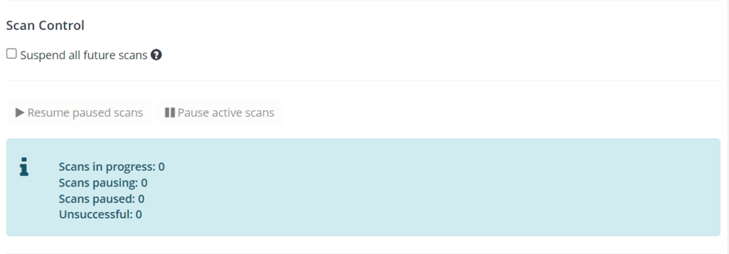 Note that the control center pauses and resumes scans in bulk. To pause or cancel any specific scan, you can use the Recent Scans page.