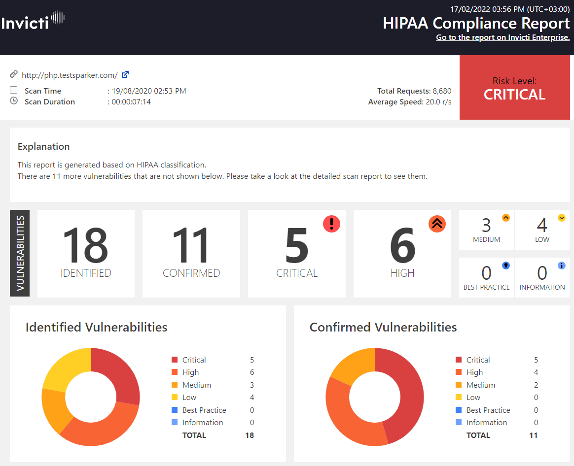 Invicti reports list vulnerabilities based on Vulnerability Severity Levels. If Invicti labels a vulnerability as critical, it lists it at the top. However, if you want to restrict the report to view only vulnerabilities that are based on specific classifications or compliance requirements, such as HIPAA, ISO 27001, OWASP, PCI DSS, and SANS, there is a series of reports among the Report Templates that enable you to do so.If your organisation processes identifiable health information, you are expected to abide by the US Health Insurance Portability and Accountability Act (HIPAA) standards.Here is an example of a HIPAA Compliance Report.