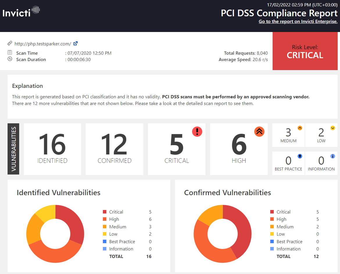 Likewise, you can generate the ISO 27001 Report to view issues that infringe this standard. In addition to breaking down vulnerabilities from a compliance viewpoint, these reports include all the relevant technical details you might expect to find in the Detailed Scan Report.The OWASP Top Ten 2017 Report is another example of a classification-style report. The OWASP Foundation has published and updated its vulnerability lists since 2003 to raise awareness for common vulnerabilities found in web applications. Similarly, if you want to see only the most dangerous software errors listed by SANS, you can generate the SANS Top 25 Report.Our final example in this category of reports is essential if your company processes credit or debit card payments. Such organisations are expected to comply with the Payment Card Industry Data Security Standard (PCI DSS) rules. Invicti can generate an unofficial PCI DSS Compliance Report based on a scan. If you need an official PCI DSS Report, you can generate it from Invicti Enterprise based on your scan results. By fixing vulnerabilities specified in these reports, you can work towards becoming PCI DSS compliant.Here is an example of a PCI DSS Compliance Report: