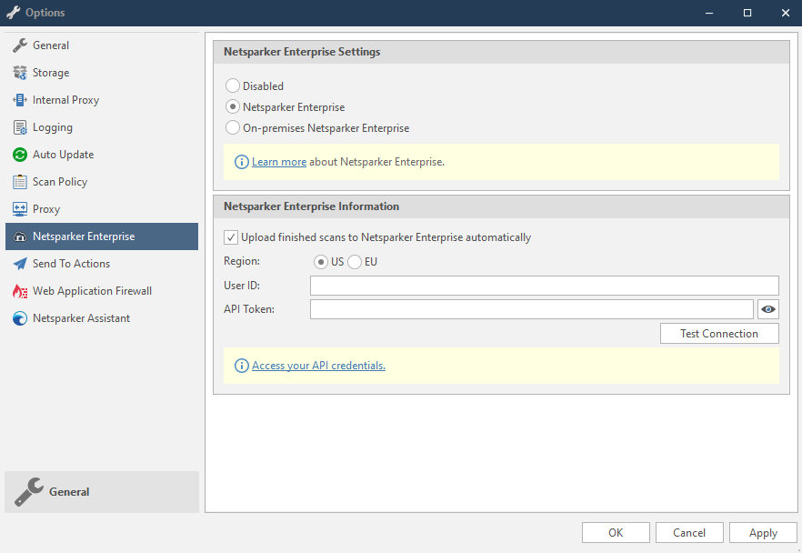 Completed Netsparker Standard scans can be uploaded to Netsparker Enterprise. We have added an Auto Export feature that enables the automatic export of all old session files not previously uploaded to Netsparker Enterprise, when connected to its servers. This new option, 'Upload finished scans to Netsparker Enterprise automatically', is enabled in the Netsparker Enterprise tab in the Options dialog.