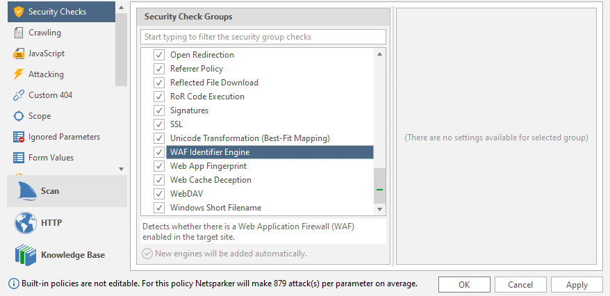 This new security check detects whether the target website in a scan is using a Web Application Firewall that blocks Netsparker attacks, and warns the user about it.