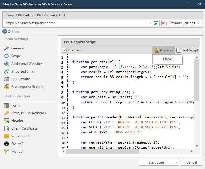 This is an authentication scheme frequently requested by customers. Users can now calculate HMAC tokens prior to each request by executing some custom JavaScript code. A scripting engine in Netsparker will execute JavaScript code. We are planning to be API compatible with Postman, since users already have the required script on their Postman environment.