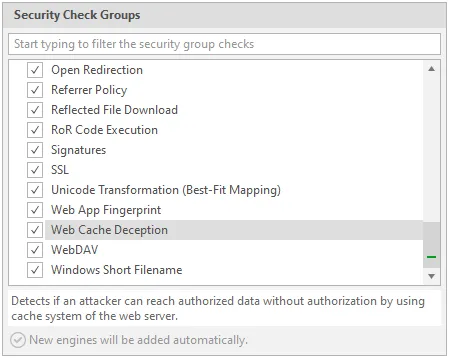 We have added a Web Cache Deception engine to the list of Security Checks. Web cache deception is a new web attack vector that affects various technologies, such as web frameworks and caching mechanisms. The attack takes advantage of default behaviors and poor configurations of various technologies that are involved in the application's architecture.