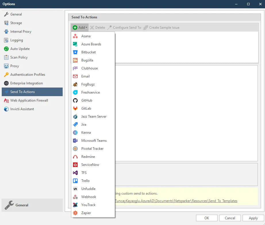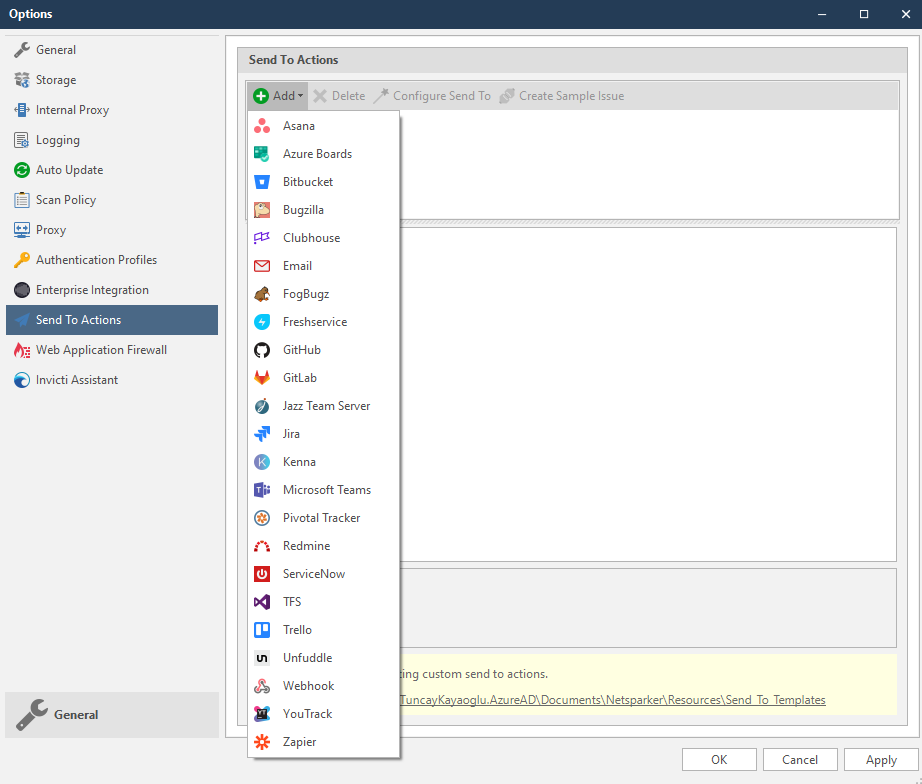 For further information on all the Send To integrations available for Netsparker Standard, see Issue Tracking Systems.