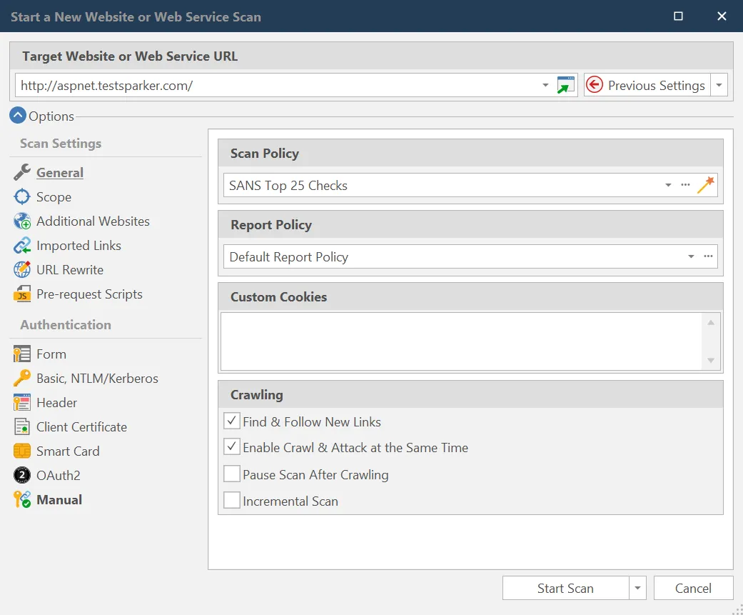 When creating a new scan in Invicti Standard, you can select the SANS Top 25 Checks scan policy from the Scan Policy dropdown in the Start a New Website or Web Service Scan dialog. This ensures that Invicti scans for these vulnerabilities.