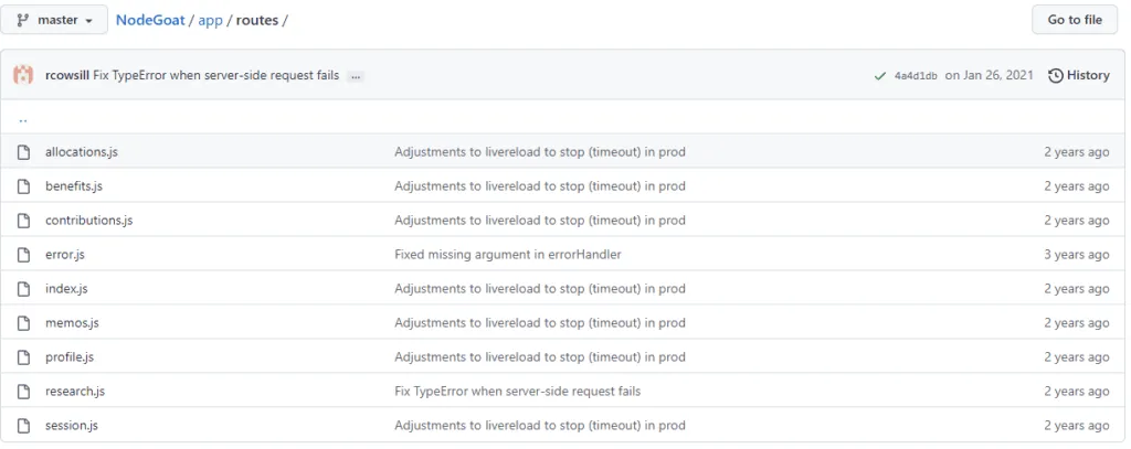In the source code of the NodeGoat application, this vulnerability is introduced in the allocations-dao.js file referenced by allocations.js in the app/routes folder. Let’s go through the process of isolating this specific file based on the vulnerability report.