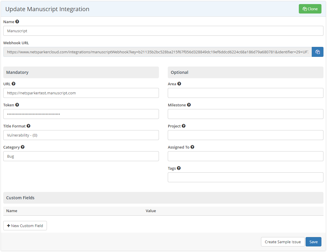 Netsparker Enterprises generates a Webhook URL after you save your integration settings. When you register this link as a webhook in your FogBugz (Manuscript) Project, Netsparker Enterprise will be able to detect changes in your FogBugz (Manuscript) cases.