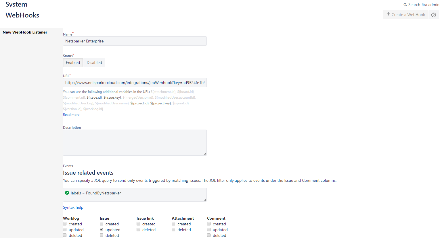 When Netsparker Enterprise issues are marked as Fixed, their counterparts in JIRA are automatically marked with the Resolved user provided status. Likewise, when Netsparker Enterprise issues are revived, their counterparts in JIRA are marked with the Reopened user provided status.Netsparker Enterprise generates a Webhook URL after you save your integration settings. When you register this link as a webhook in your JIRA Project, Netsparker Enterprise will be able to detect changes in your JIRA issues and compare them with the user-provided Reopen and Resolved statuses.