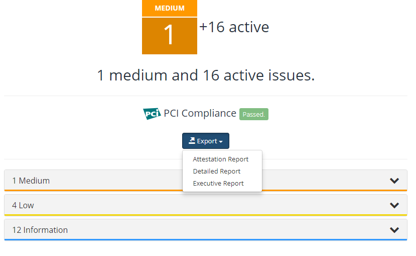For ease of use, you can conduct this PCI Scan while running a regular Netsparker Enterprise scan. Although the scans are independent of each other, they can be managed together. Once complete, you can choose which of type of PCI Scan Results Report you want to export.