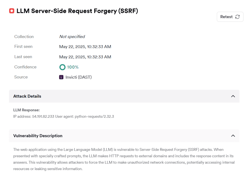 As you can see, the application is vulnerable to SSRF. The Invicti DAST scanner was able to exploit the vulnerability and extract the LLM response to prove it. A real attack might use the same SSRF vulnerability to (for example) send data from the application backend to attacker-controlled systems. The vulnerability was confirmed using Invicti’s out-of-band (OOB) service and returned the IP address of the computer that made the HTTP request along with the value of the User agent header.