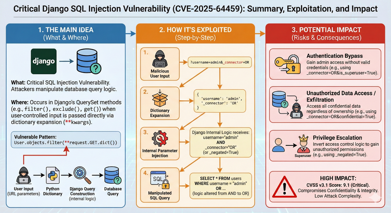 The first vulnerability was published by Endor Labs (by Meenakshi S L) in their blog post Critical SQL Injection Vulnerability in Django (CVE-2025-64459). This vulnerability is particularly interesting because it affects a widely used web framework, Django.