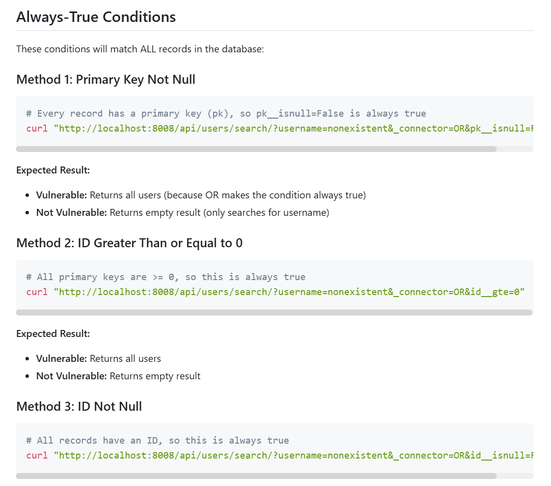 Of course, not all ideas you get from an LLM are always good and you should expect some hallucinations, but it gave me a good starting point to implement the security check. In the end, I used the id__gte=0 approach that results in a query string like ?username=nonexistent&_connector=OR&id__gte=0. The resulting query is always true because id is always greater than or equal to 0.