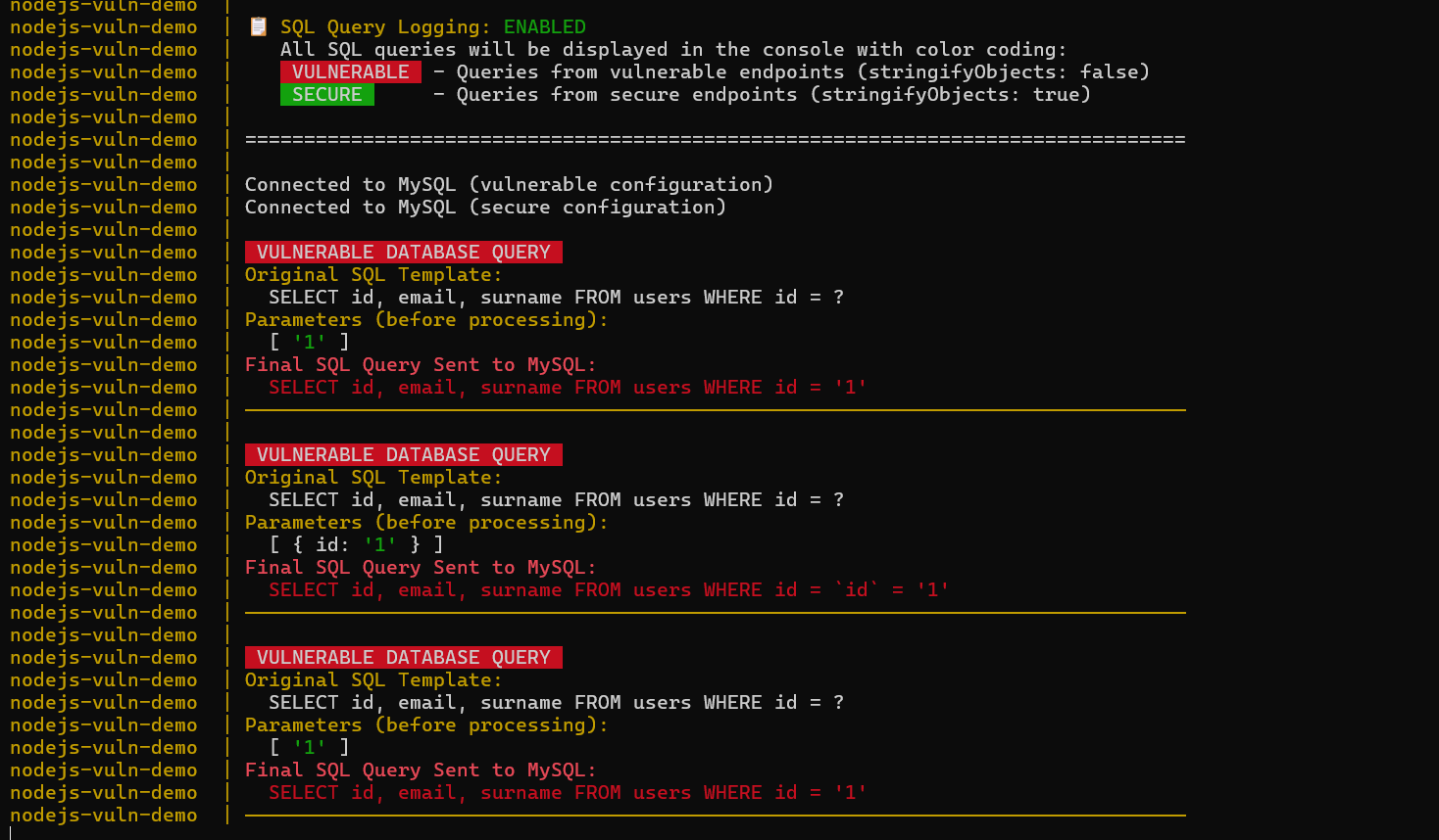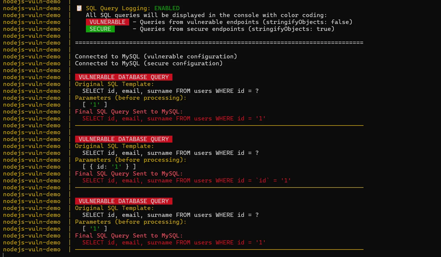 While investigating the vulnerability, I realized it would be helpful to see the SQL queries in the docker console to understand better how the injection works. So again, I asked Claude Code to help me modify the generated application to log all SQL queries to the console.
