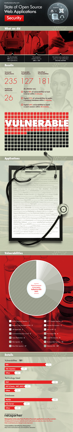 In this analysis the Netsparker team used Netsparker Web Application Security Scanner to scan a number of popular open source web applications and identify vulnerabilities in them. The results are very shocking and explain why malicious hackers are always a step ahead of website owners. A vulnerability statistics infographic was also generated from the results.