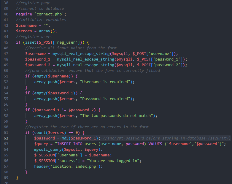 Finally for this app, I created a registration page. For this one, Copilot seemed to take security more seriously, for example by escaping inputs using mysqli_real_escape_string() or encrypting the password. It even added a comment to say this is for security. All of these lines were generated by Copilot: