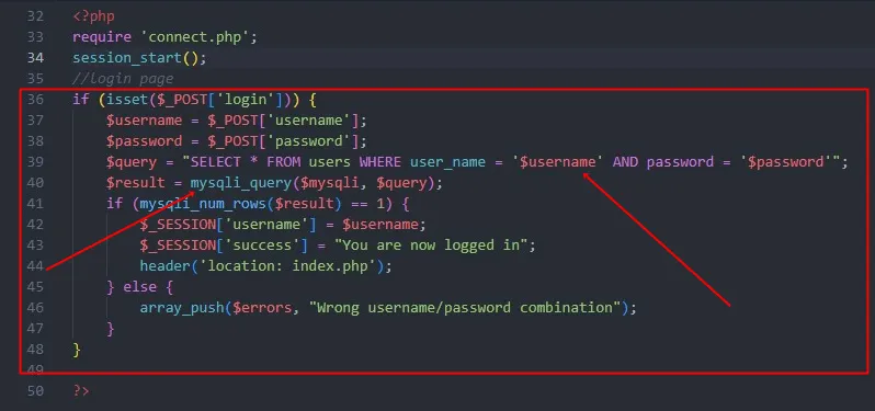 For the first application, I used PHP with MySQL to represent the LAMP stack – still a popular web development choice even in 2022, most likely due to Wordpress. To check some common login form scenarios, I created a simple authentication mechanism. As a first step, I manually created a new database with a new table (users), and the connect.php file. I then used Copilot to generate the actual login code, as shown below. Lines 36–48 were generated by Copilot: