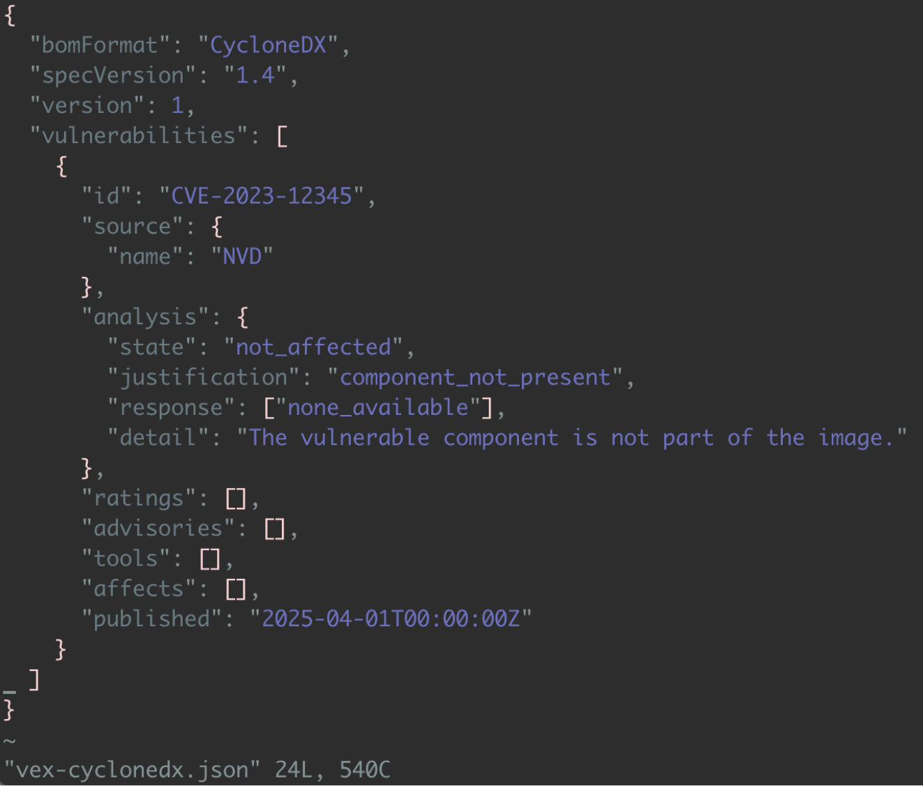 VEX is a standardized way to communicate the exploitability status of vulnerabilities in software components. Instead of treating every CVE as a critical issue, a VEX document tells you whether a vulnerability is: