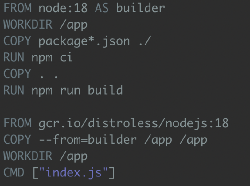 In this example, we use a standard Node.js image to install dependencies and build the application. Then, the final production stage runs the app using a much smaller distroless image. This approach reduces image size, eliminates development tools, and enhances overall security.