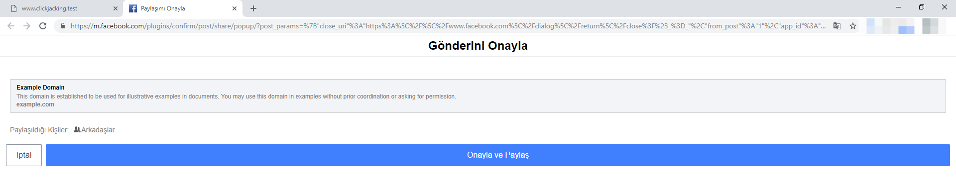 So, how does Facebook's fix work? Whenever you click the button to share the post, the second confirmation page opens in a new tab. It asks you whether you want to share the message and lets you choose the people you want to share the link with. The new page opens due to the “_blank” value added to the target attribute in the href element on the first page. Whenever it is set, the linked page behind the link is opened in a new tab. This results in a thwarted clickjacking attack. This is because, the new tab correctly implements the X-Frame-Options: DENY feature.It's hard to say why Facebook decided to open a completely new tab to share a message. This makes sharing just a tiny bit more inconvenient. For a company like Facebook, that aims to make sharing content as effortless as possible, this sounds like a terrible fix. I wouldn't be surprised if this was only a temporary solution or if Facebook actually used this second page as extra advertising space.