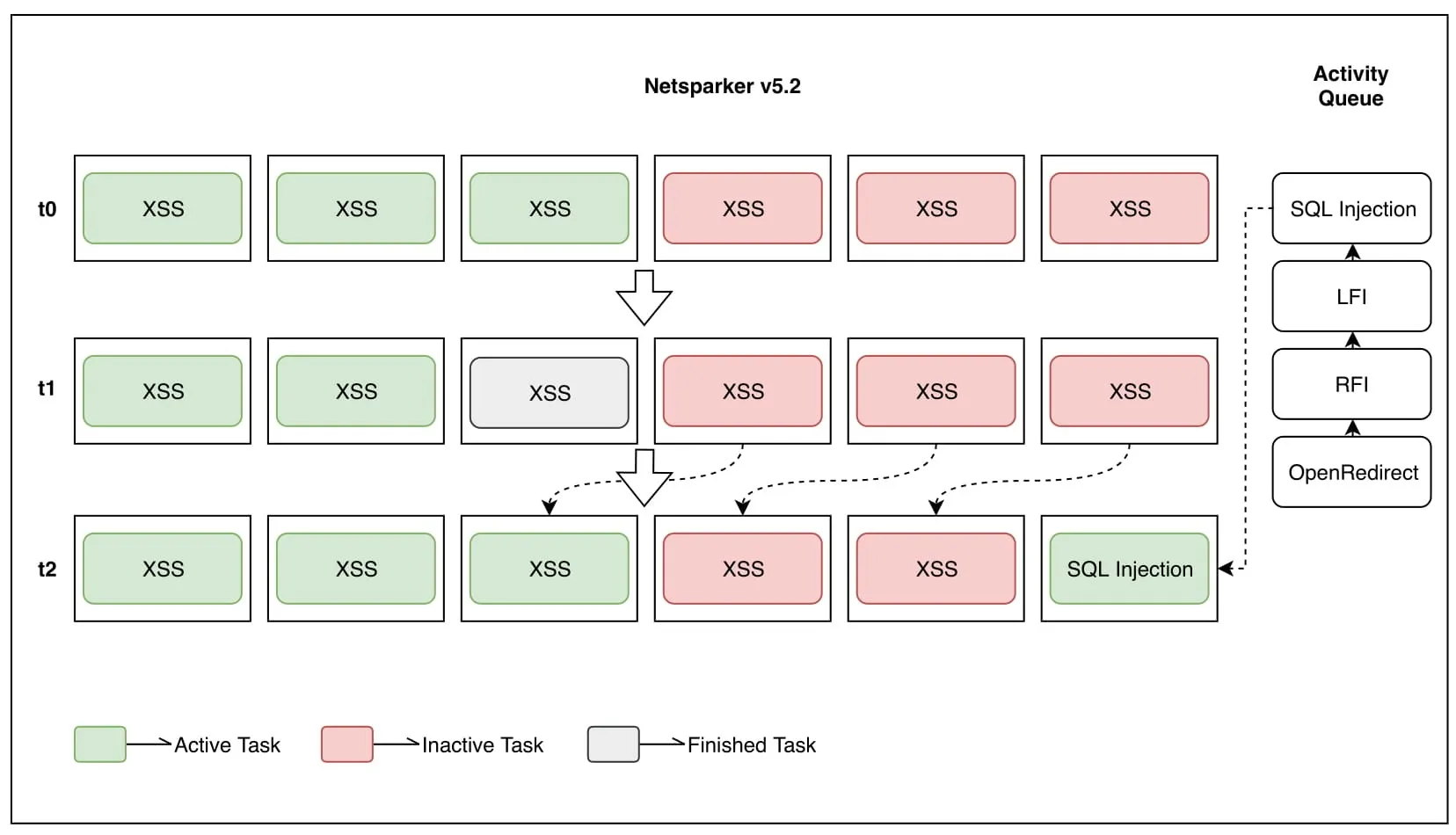 Prior to these changes, there would have been times where activities were waiting for each other to continue executing the scan.Let's look at an example, illustrated below.One good example involves DOM simulation tasks. To be able to keep the CPU and Memory usage low, a maximum of three concurrent DOM simulations (illustrated in t0 in the diagram) are conducted at any given time. If there were already three active DOM simulations, a request was sent from an activity to check for an XSS vulnerability would occupy a task slot, remain static and wait its turn. So, if there were three active and three inactive XSS tasks at time-zero (t0), only three of them would actually be active.