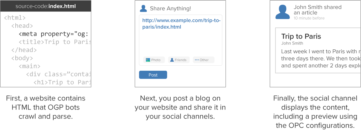Here are the OGP configurations used for a blog post published on our website, Using GoogleBots as an Attack Vector:<meta property="og:url" content="https://www.netsparker.com/blog/web-security/using-google-bots-attack-vector/" /> <meta property="og:description" content="This article examines the latest attack vector to surface: using Google Bots." /> <meta property="og:type" content="article" /> <meta property="og:title" content="Using Google Bots as an Attack Vector" /> <meta property="og:image" content="https://cdn.invicti.com/statics/img/ogimage/Using-Google-Bots-as-an-Attack-Vector.png" />This is an illustration of how the Open Graph Protocol methodology works on social media platforms.