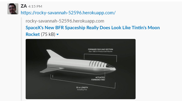 In research conducted by U.S. cyber security company ZeroFox, the varying rendering of the OGP across various social media platforms was evaluated to see how it could lead to phishing attacks. ZeroFox analyzed the visibility of the shared URL, and the URL in the OGP configuration, in the preview of shared links.ZeroFox researchers compared the previews of the shared links generated by the OGP on platforms such as Slack, Facebook and Tumblr. In the proof of concept, the OGP settings of an article from space.com was added to the test website controlled by the 'attackers' (rocky-savannah-52596.herokuapp.com). The URL of this test website was shared on social media platforms to observe the behavior of the Open Graph Protocol when displaying the source URL in the preview.