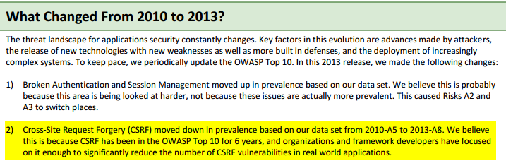 CSRF attacks were at number 5 in the OWASP Top 10 list published in 2010, but they declined to number 8 in the OWASP Top Ten in 2013. People suggested that the reason for this was increased awareness of CSRF and the common use of Anti-CSRF tokens by frameworks.