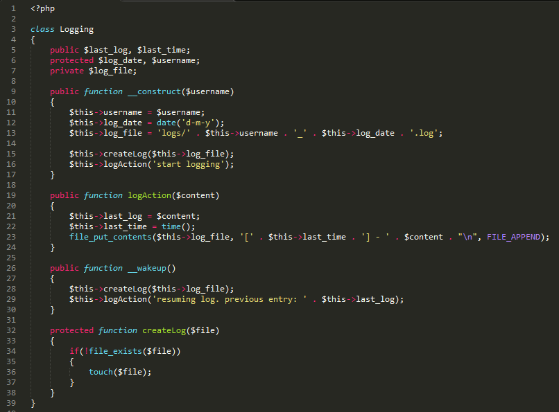 Later in the code, there is the method createLog, that creates a new log file if it doesn't yet exist, and then the logAction function writes a new log entry into the file. However, there is one method in the Logging class that we've not yet mentioned: __wakeup. You can tell that it's a magic method like __construct from its initial two underscore characters. However, instead of being called after a new instance of a class is created, __wakeup will be called as soon as a serialized object of the class is deserialized.