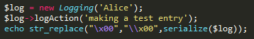 s:11:"\x00*\x00log_date";s:8:"07-09-17";This follows the same logic as above, but this time we have a protected property. Serialize indicates that the property is protected by putting '\x00*\x00' in front of the property name.s:17:"\x00Logging\x00log_file";s:23:"logs/Alice_07-09-17.log";This is what a private property looks like. Instead of the asterisk character, Serialize puts the filename between the two null-bytes. Keep in mind, that instead of '\x00', serialize uses an actual null-byte. You should remember this when you read the output of Serialize, as they are non-printable characters.