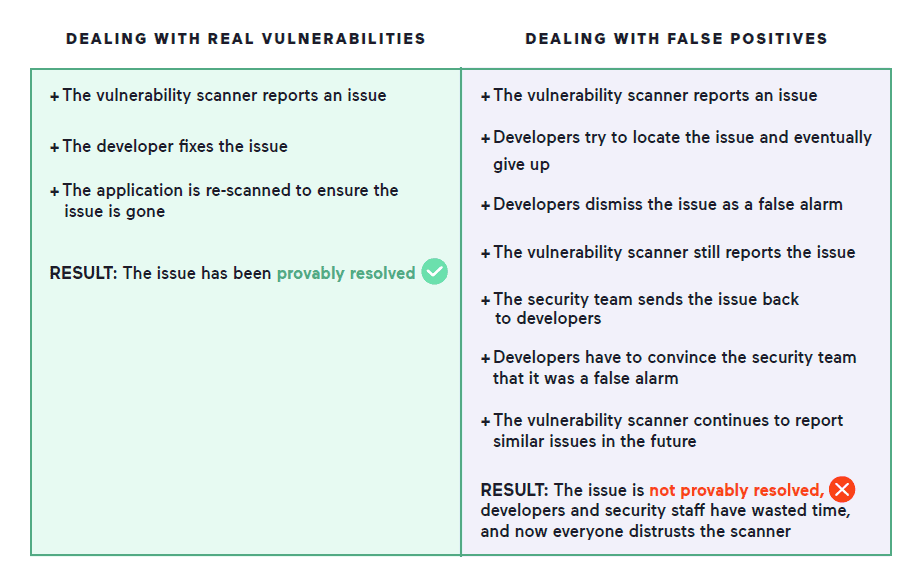 To keep up with the fast pace of modern web application development, vulnerability testing requires automated tools to assist in finding vulnerabilities. Unfortunately, apart from legitimate vulnerabilities, automated scanners can also report false alarms, or false positives, which must be further investigated manually just like real vulnerabilities. As systems and applications grow, the number of false positives can rapidly increase and place a serious burden on developers and security teams, with negative consequences for the development process, application security, and business results.