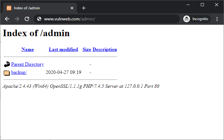 A user makes a website request to www.vulnweb.com/admin/. The response from the server includes the directory content of the directory admin, as seen in the below screenshot.