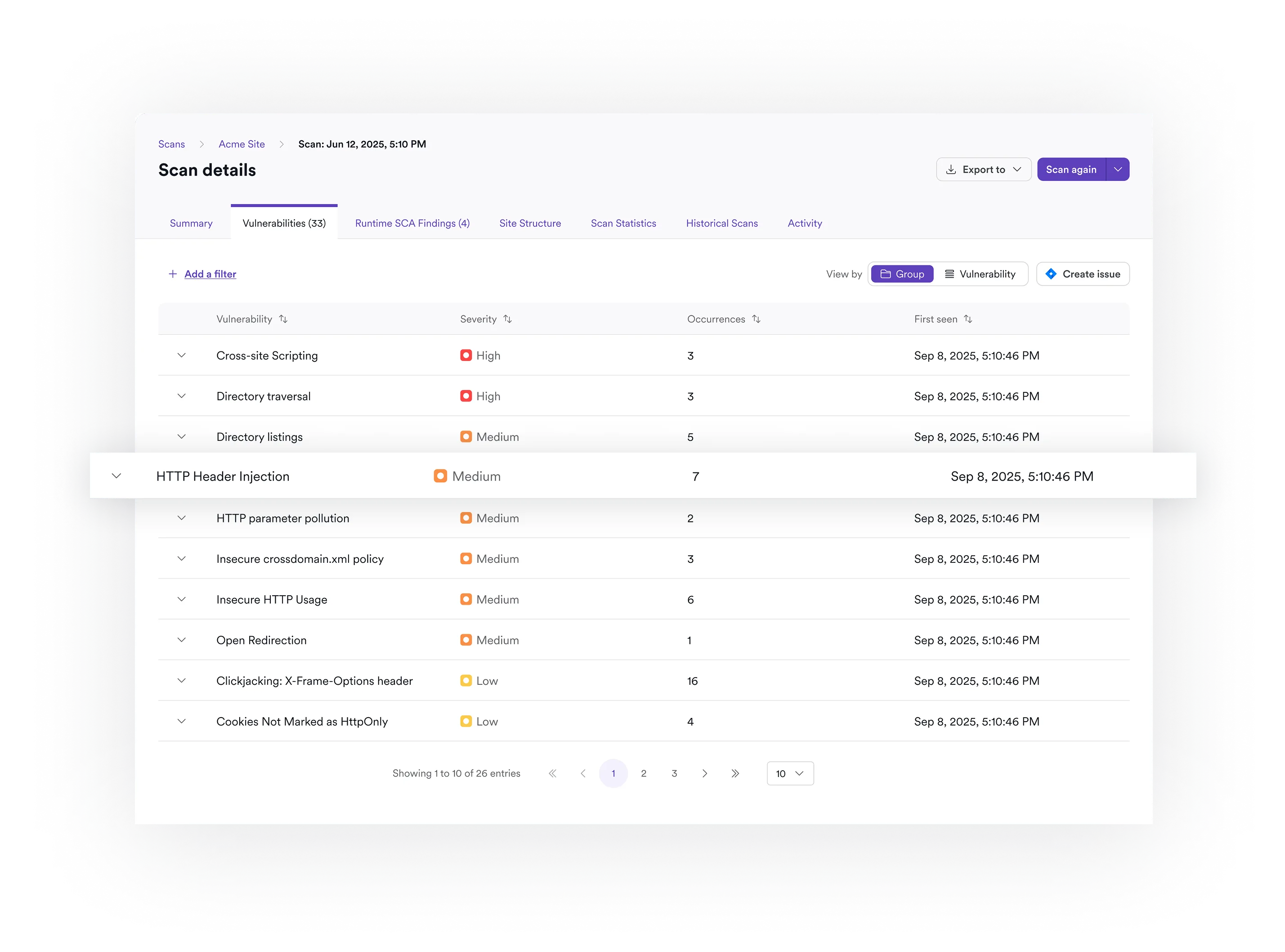 AI-aided correlation and deduplication link results across SAST, SCA, DAST, and container scanners. By normalizing and validating vulnerabilities, teams see a single confirmed issue instead of multiple duplicates.